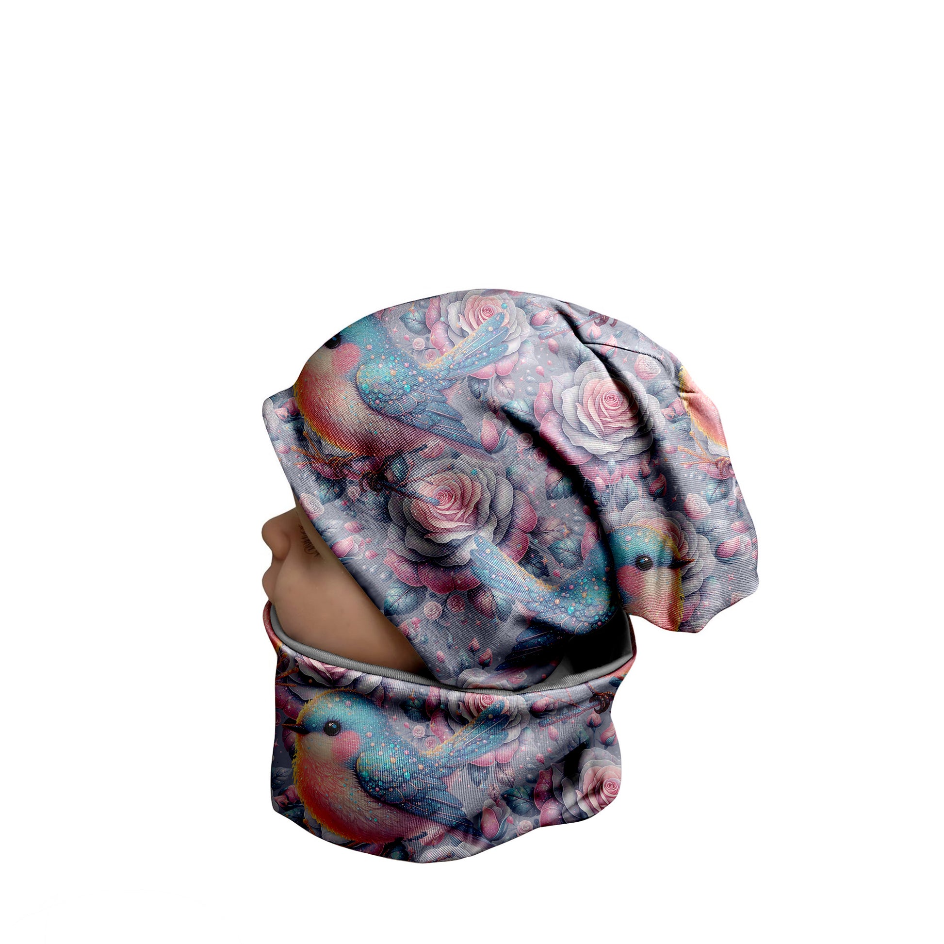 Die Größe richtet sich nach dem aktuellen Kopfumfang des Kindes. Der Innenstoff kann zwischen Fleece (für kalte Tage) und Jersey (perfekt für den Übergang) ausgewählt werden.